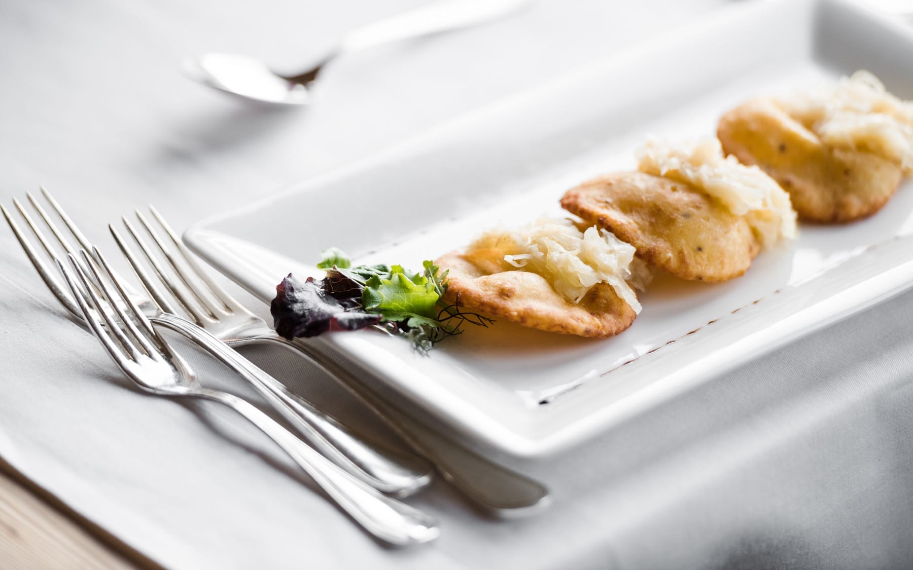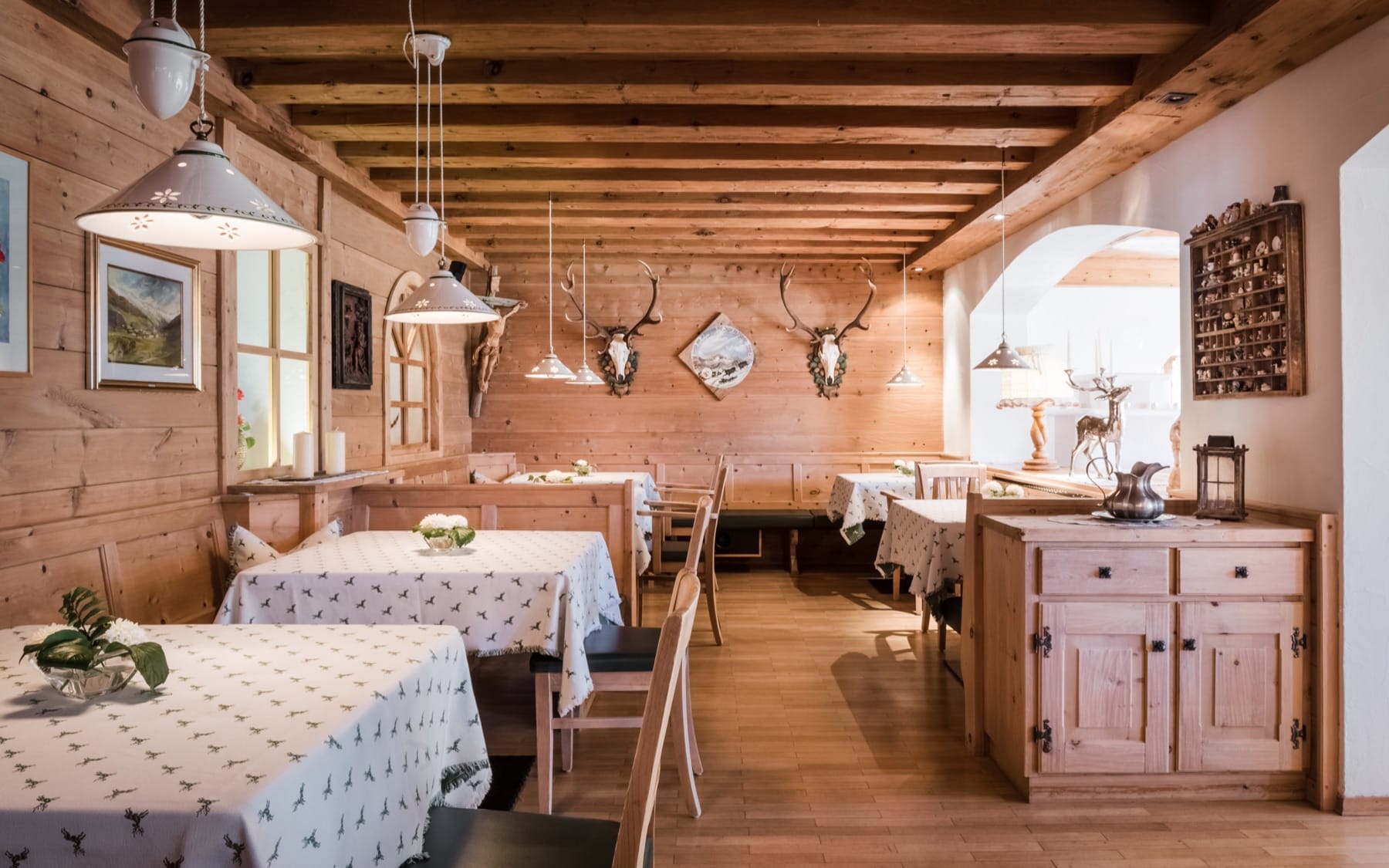 Waiters in traditional clothing and alpine music accompaniment are an ideal frame for the simple tultres - pancakes filled with spinach and ricotta - or the cancì checi, cooked personally by Signora Caterina. Balotes, zigher gnoch, crafuns mori, cütles da pom and puncerli are just some other names for Ladin dishes that will echo in our traditional stube during the evening. We also mustn't forget panicia, a delicious barley cream that has always been prepared following grandmother's recipes, or a succulent pork shank that used to be cooked only for rare and special occasions.